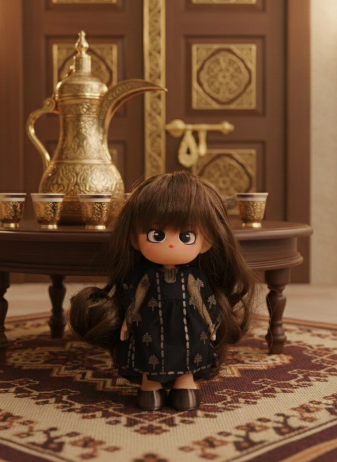 A doll inspired by classic Najdi elegance, wearing a black embroidered dress that reflects simplicity and strength.